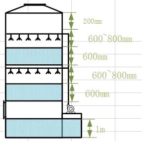 填料高度:600mm,水噴淋高度尺寸:600~800mm,累加起來(lái)出口高度為200mm